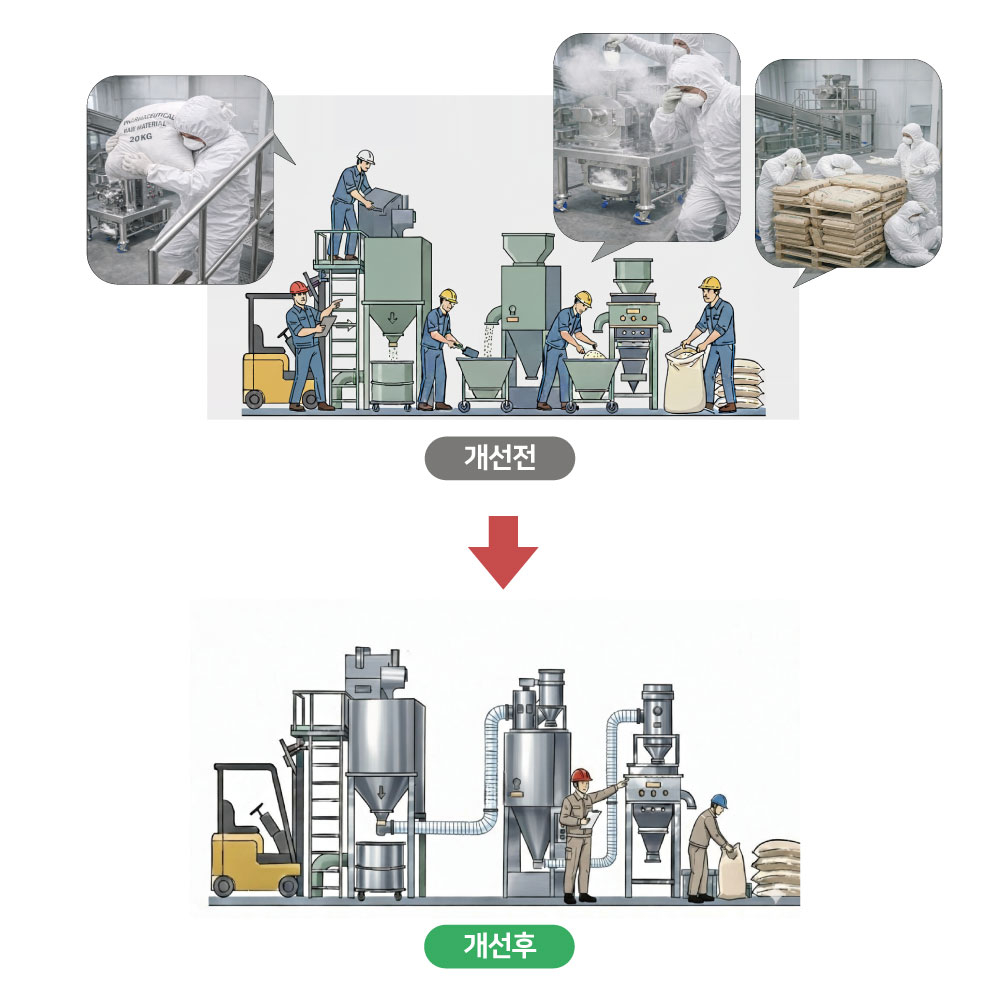 이차전지, 제약, 식품, 화학, 바이오, 화장품 가공/제조 공정에서 원료 및 제품의 이송에 적용하고 있습니다.